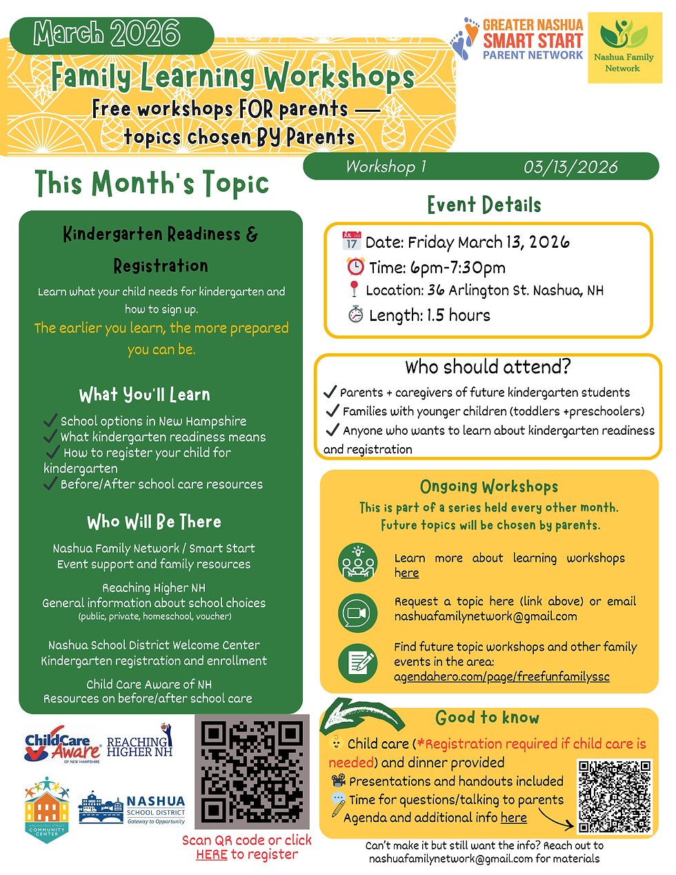 Join Nashua Family Network for a parent chosen workshop about kindergarten readiness for your child. This will be held on March 13th from 6-7:30pm. Free dinner and childcare will be provided! Register by clicking here.