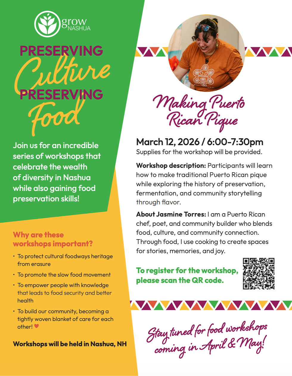Join the ASCC and Grow Nashua for a workshop on March 12, 2026 from 6-7:30pm. Jasmine Torres will teach participants how to make traditional Puerto Rican pique while learning about food preservation, culture, and community. Register by clicking here.