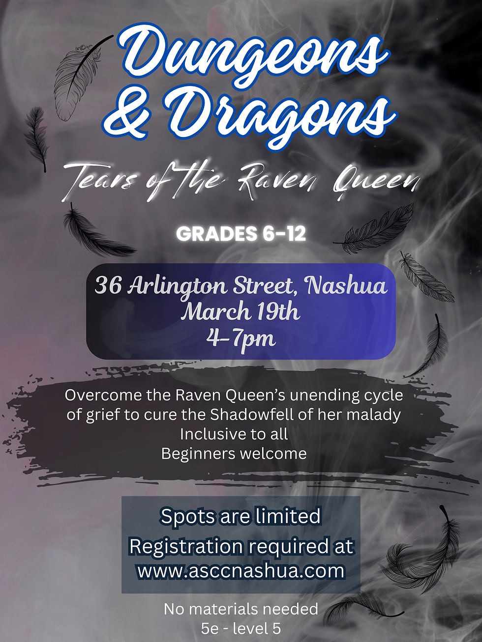 Join us from 4-7pm March 19th at the ASCC. Grades 6-12, join together to Overcome the Raven Queen’s unending cycle of grief to cure the Shadowfell of her malady. Inclusive to all. Beginners are welcome. Register by clicking here. Spots are limited