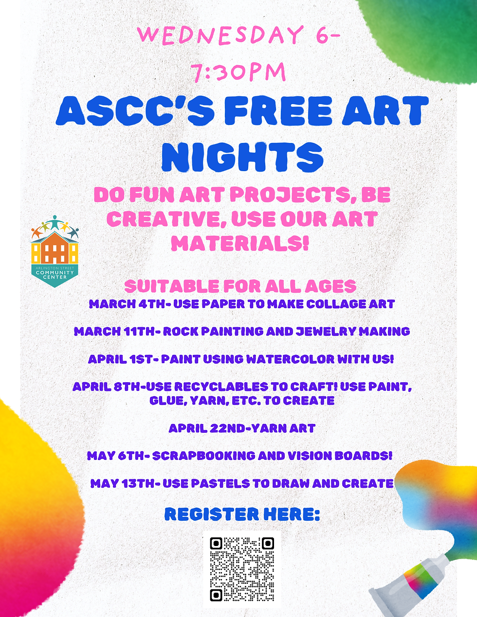 Join us for our Free Art Nights every Wednesday from 6-7:30pm. This class is suitable for all ages. Come to make fun art projects and be creative. Register by clicking here